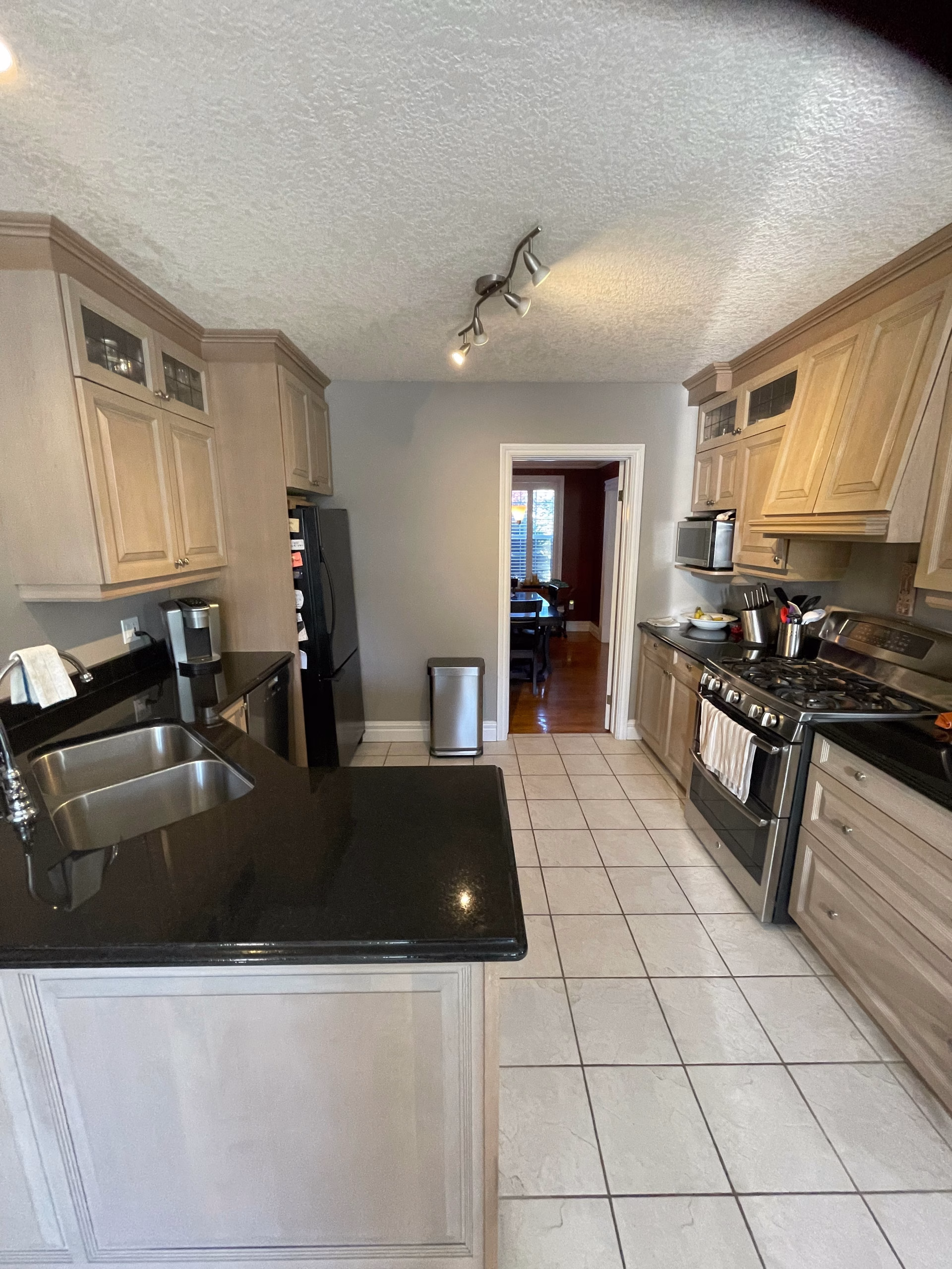 Our client started with sleek new floors and a kitchen redesign, moving the fridge and sink to accommodate a built-in oven, and added on a living room and laundry update to match.