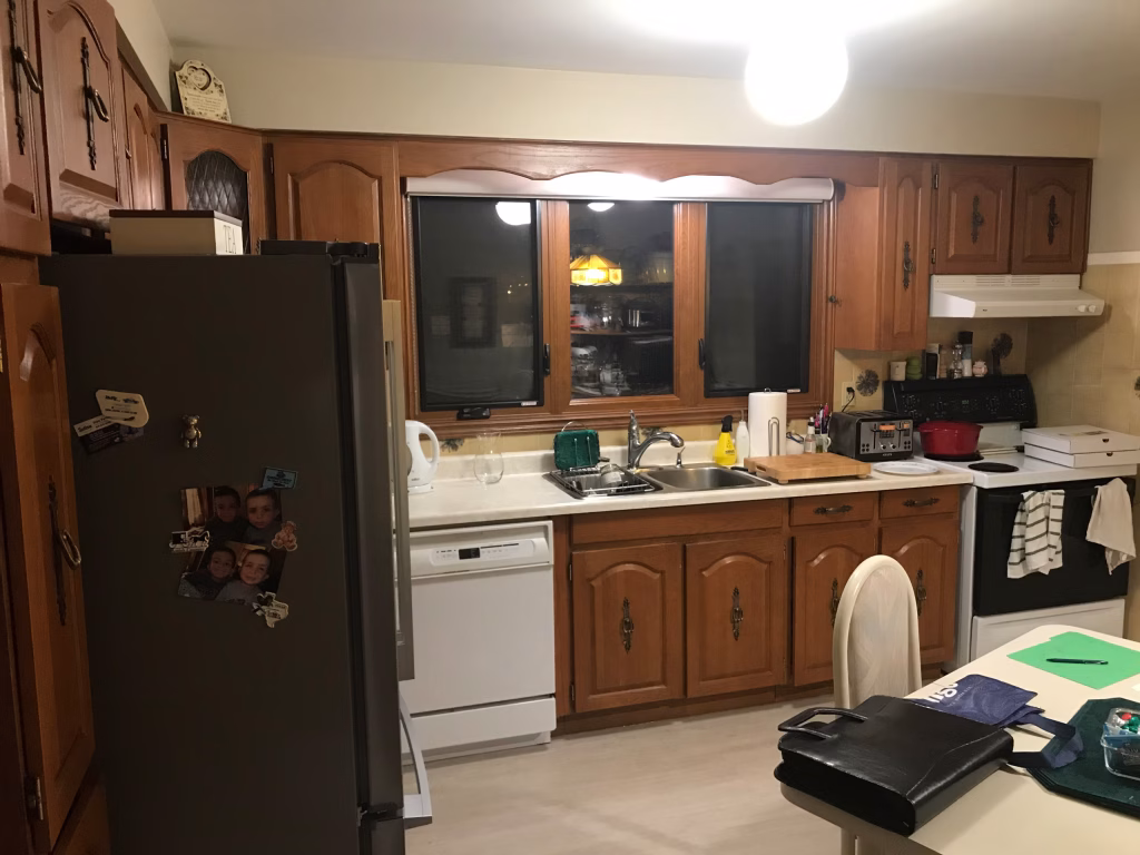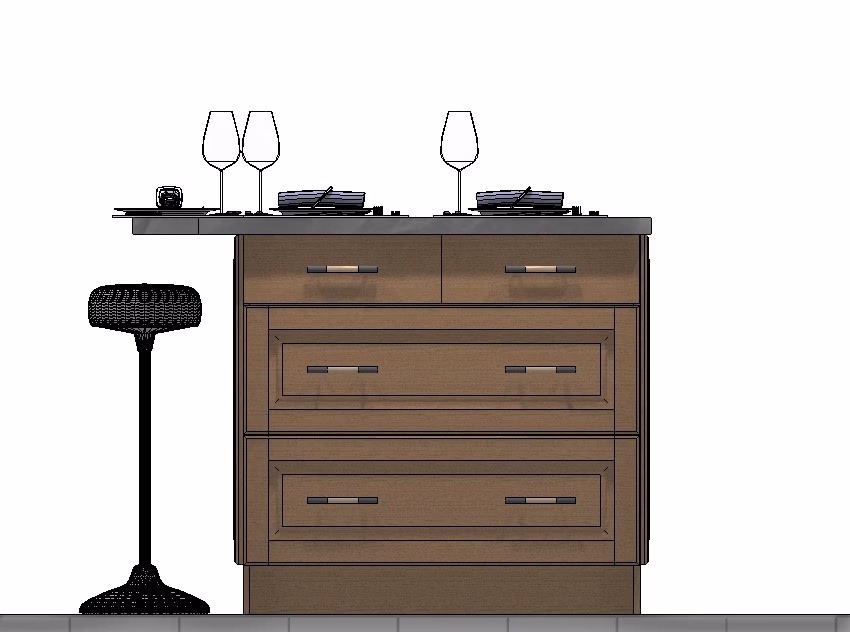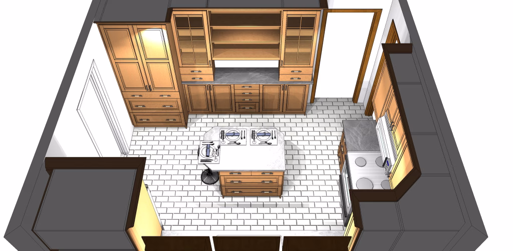 We measured, drew, and 3D modeled the new kitchen to make sure everything looked just right. The detail in the 3D modeling allowed the client to test out different floor and countertop materials, and arrangements of appliances such swapping the fridge and stove and visualizing how a built-in the microwave might look above the stove.